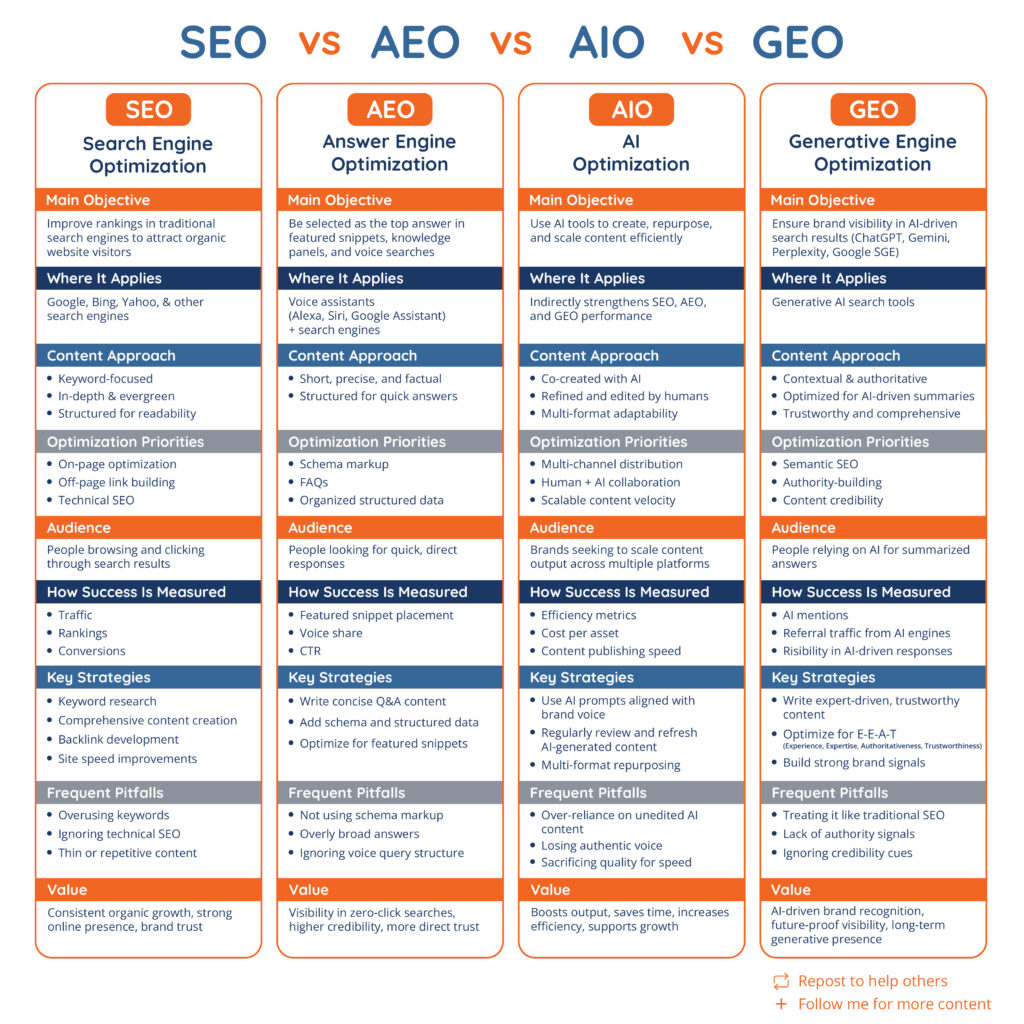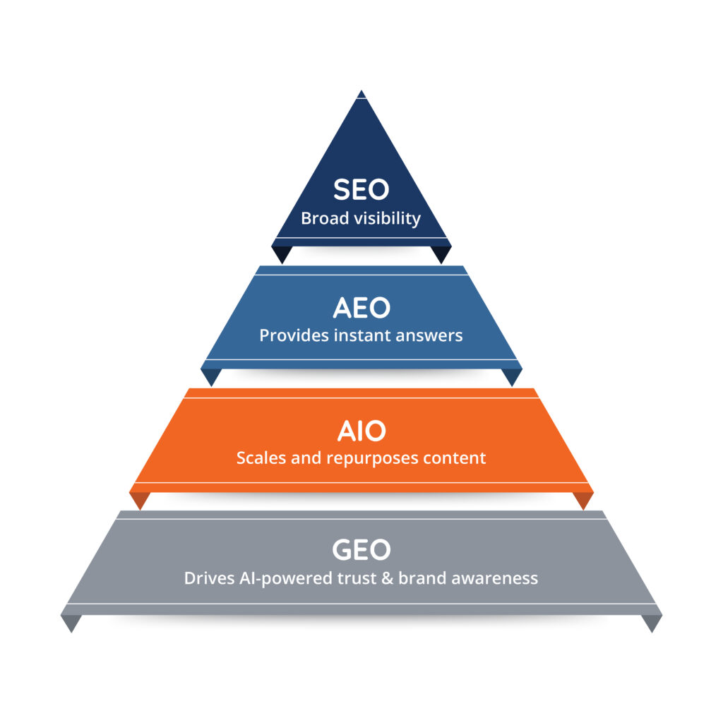 The evolution from SEO to AEO to GEO represents an expansion, not a replacement. Traditional SEO still drives traffic, AEO captures position-zero visibility, and GEO ensures AI accurately represents your brand. The winners won’t be those optimizing for today’s algorithms but those building lasting authority across all discovery channels.